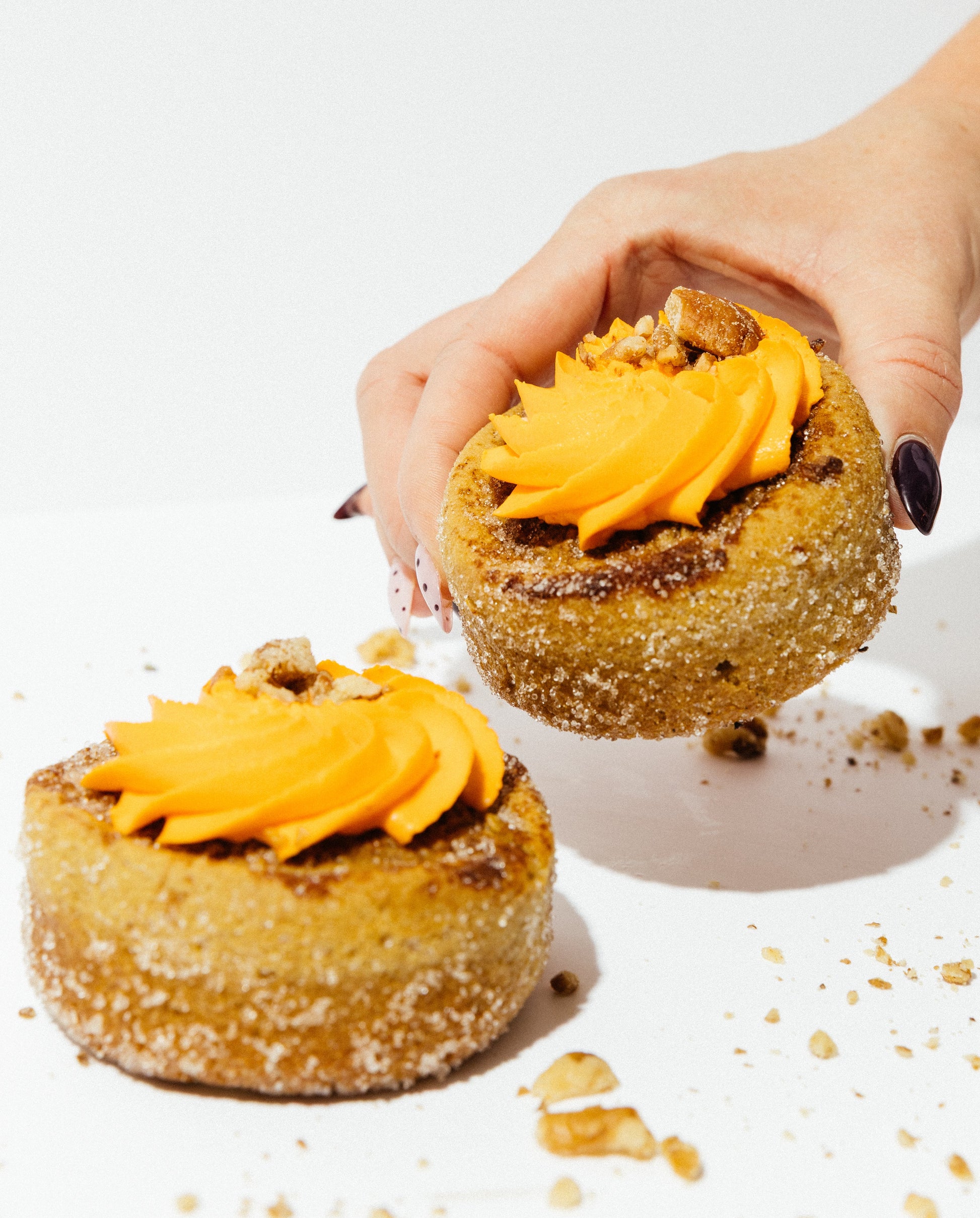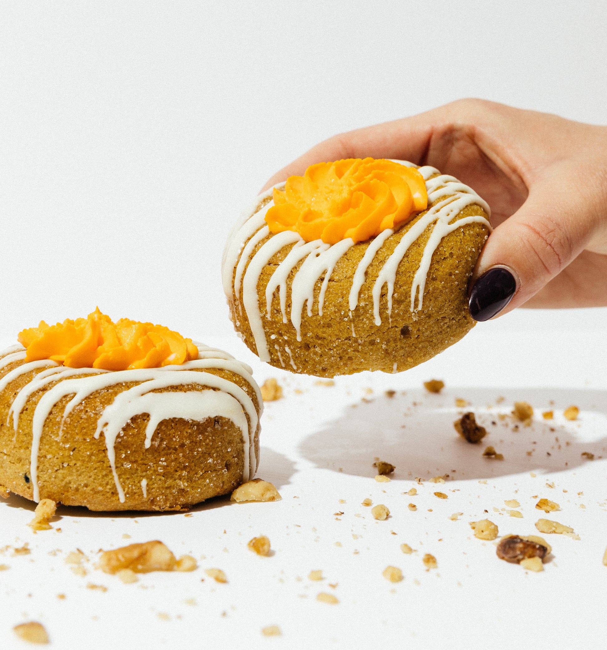 gluten free oat flour, whey protein, oat milk, apples, eggs, coconut oil, cream cheese, pecans, cinnamon, ORANGE: maltodextrin, turmeric, beet juice concentrate, citric acid, pectin, gum arabic, ascorbic acid, stevia, baking powder, sea salt, vanilla.